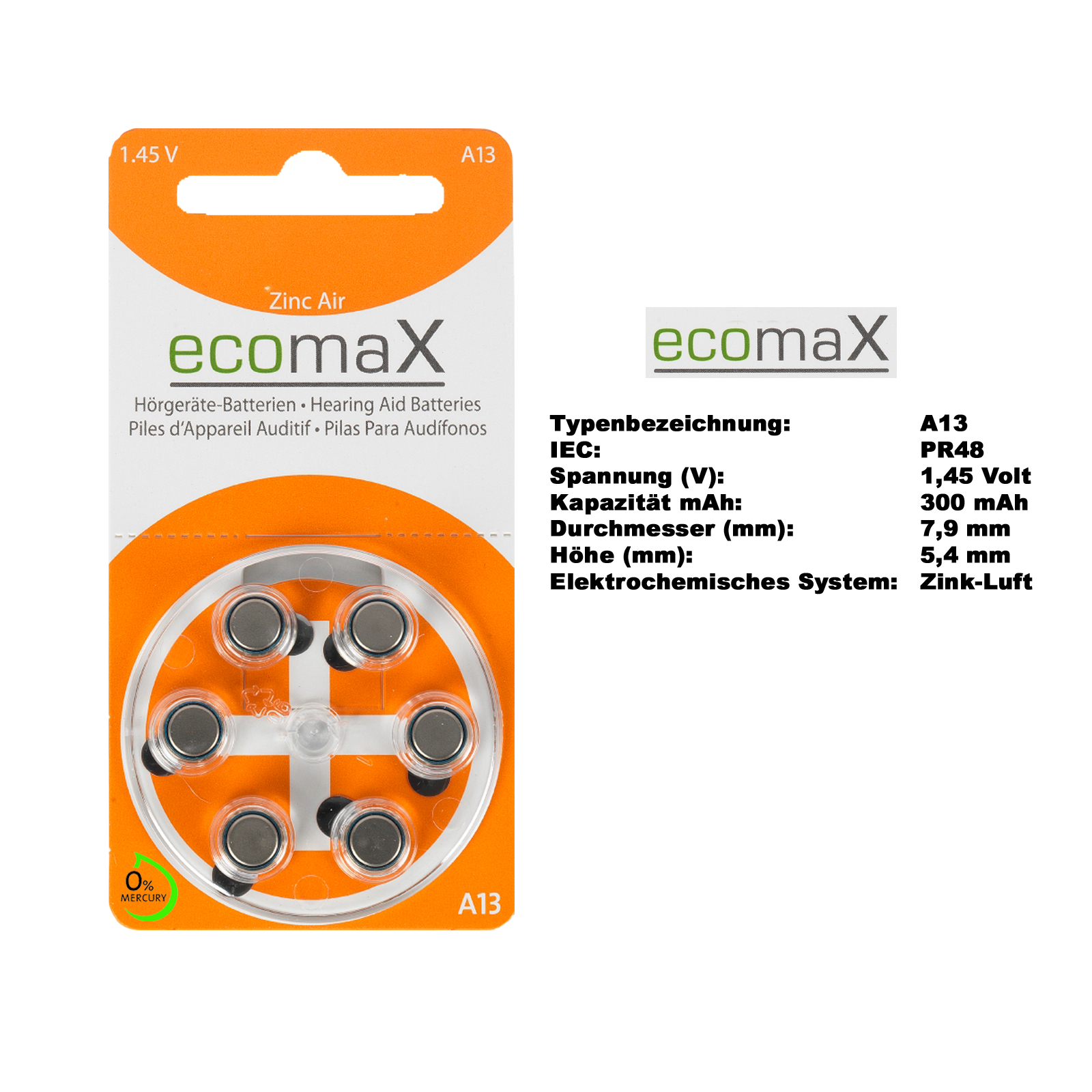 Produktinformationen "60 Batterien ecomax Hörgerätebatterie Typ 13 Orange PR48"