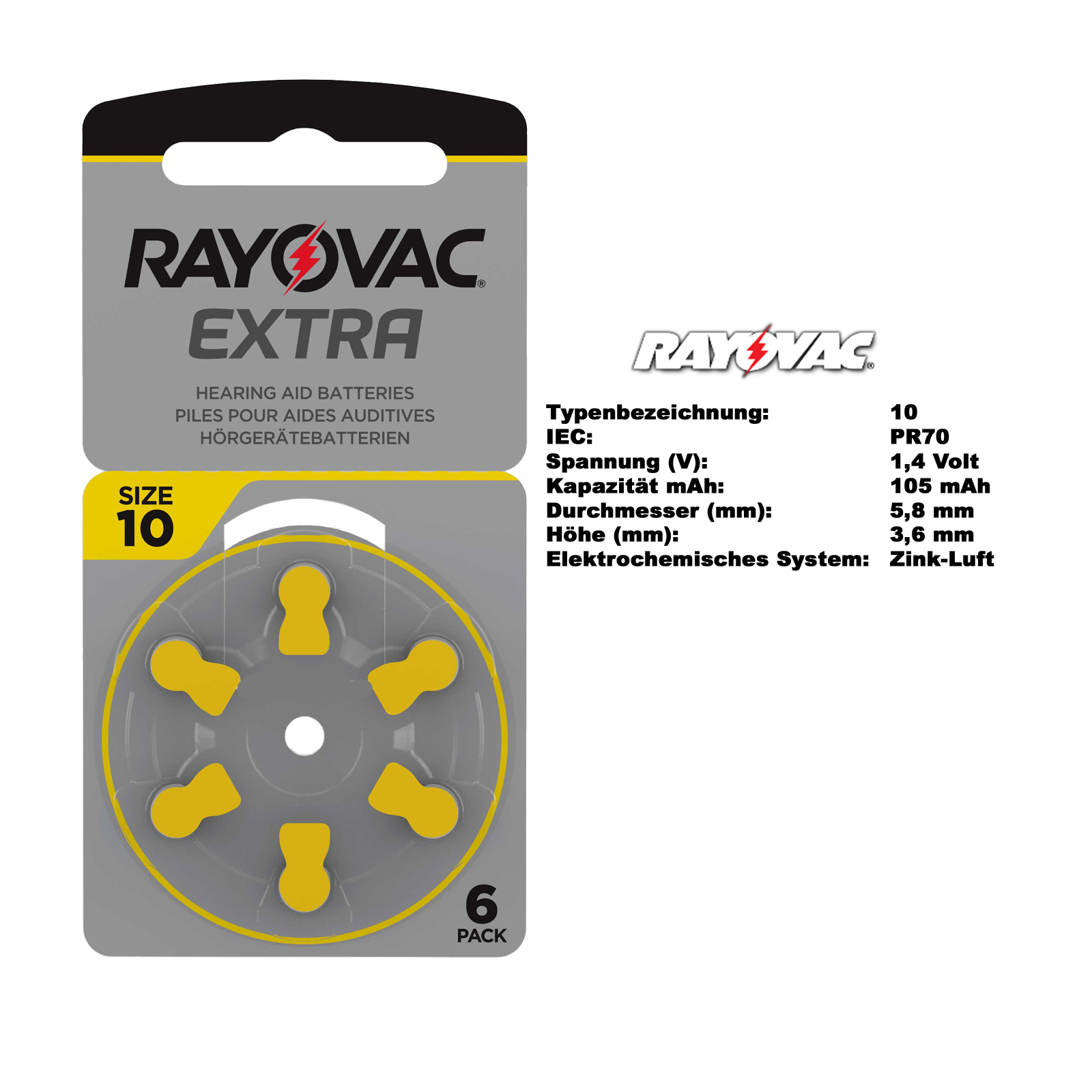 30 Stück Rayovac Hörgerätebatterie Typ 10 PR70 Gelb A10