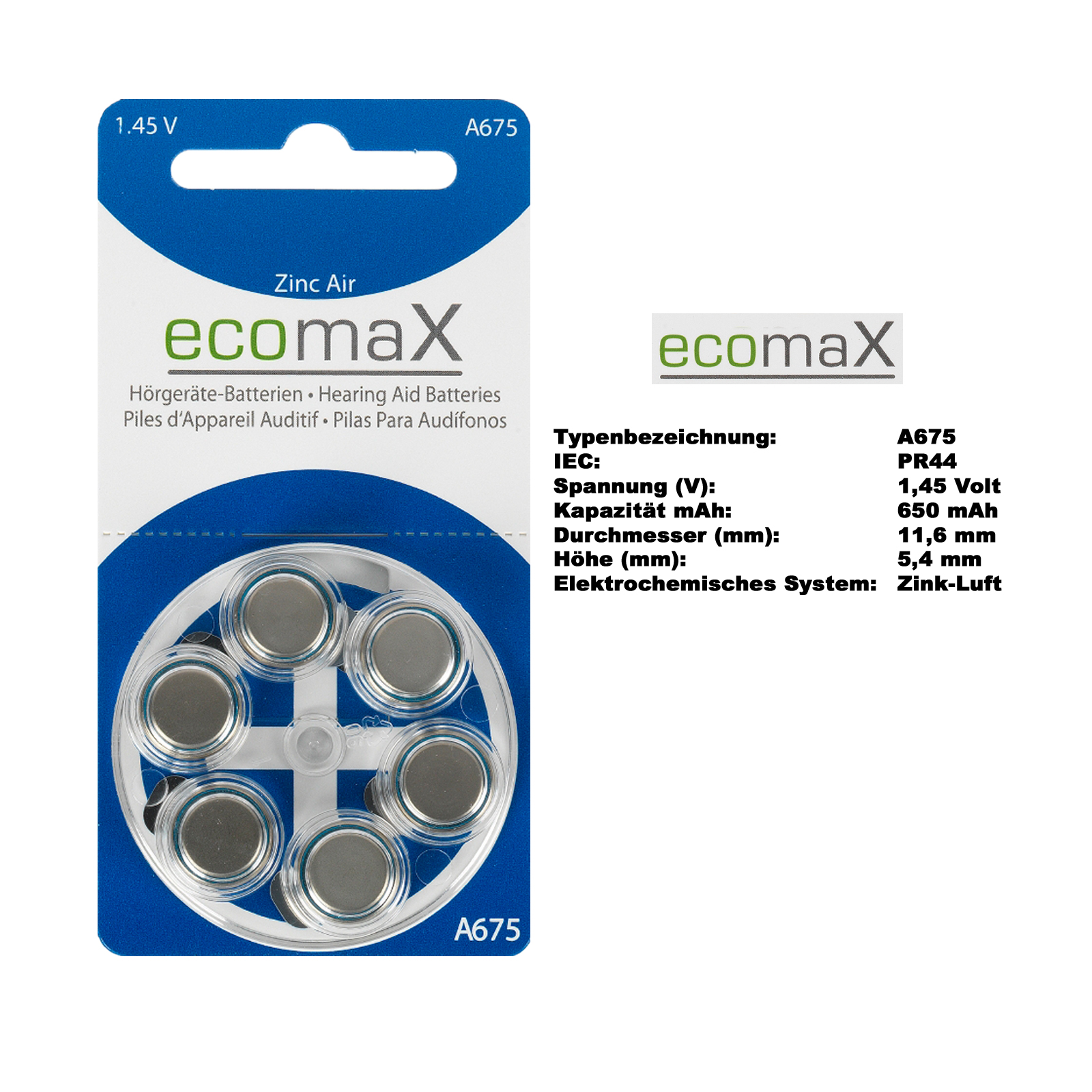 ecomax HÖRGERÄTE BATTERIE Typ 675 PR44 blau A675